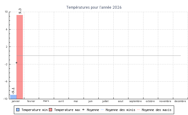 | janvier | -9.1 °C | -5.5 °C | 9.3 °C | 4.9 °C | -1.7 °C | 1.7 km/h | 25.7 km/h | SSO |